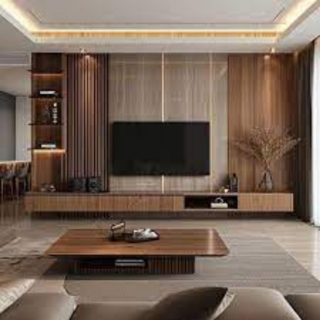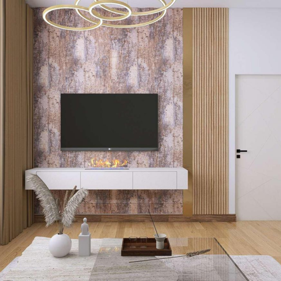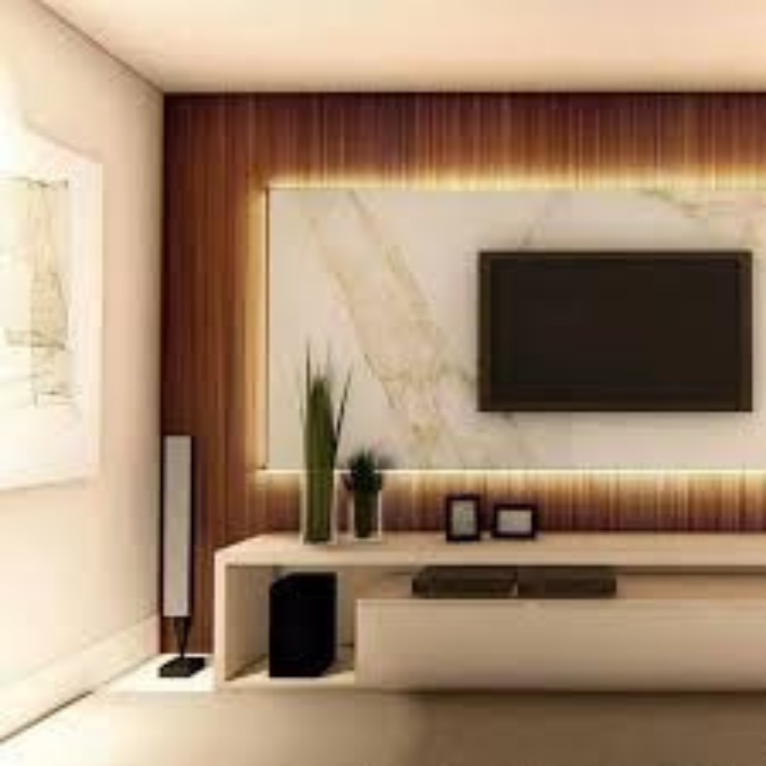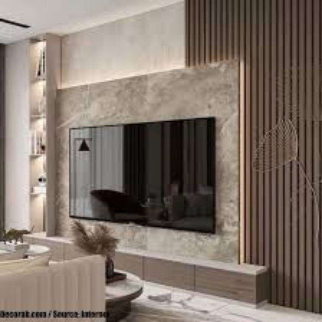 تصميم الجدران والحائط:يمكن إنشاء تصميم متميز خلف التلفاز باستخدام ورق الجدران والألواح الخشبية والزجاج وأنواع الأحجار وقطع الرخام والسيراميك.